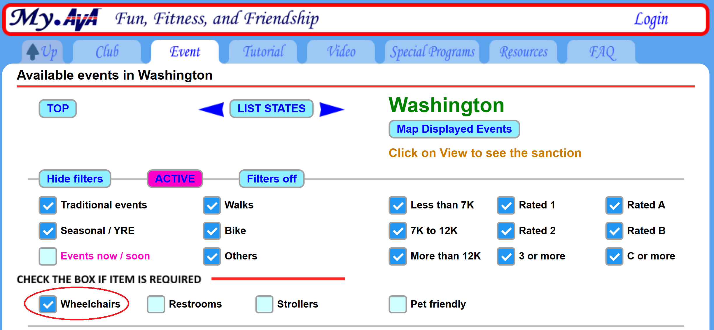 To find a wheelchair accessible walk, first go to this page https://ava.org/find-by-state/ Then pick the state you’re interested in. The next screen will allow you to start filtering the walks. In this example I picked Washington State. In the bottom left of this image you can see I checked the Wheelchairs option. This will limit the walks listed to those that can accomodate wheelchairs.